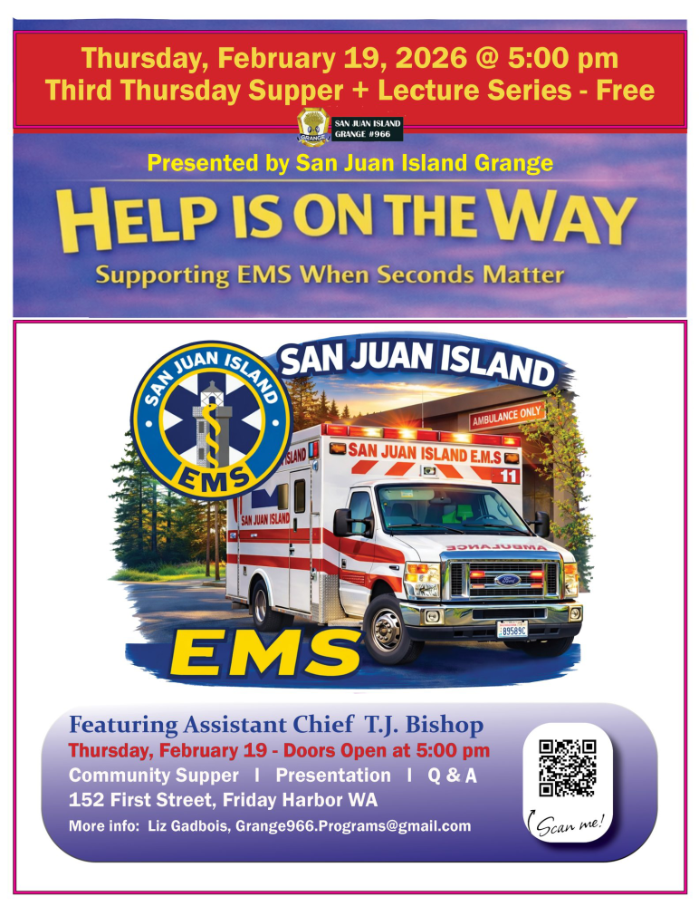 Third Thursdays Supper & Lecture Series event focused on practical first aid and emergency care skills that can help save lives while Emergency Medical Services are en route. The evening will feature Assistant Chief T.J. Bishop of San Juan Island EMS, who will share clear, calm guidance on what to do in an emergency — including when to call 911, how to stay calm, and how to provide essential care until professional help arrives. The talk is designed for all ages and backgrounds, with an emphasis on confidence, preparedness, and supporting EMS in a rural island setting.