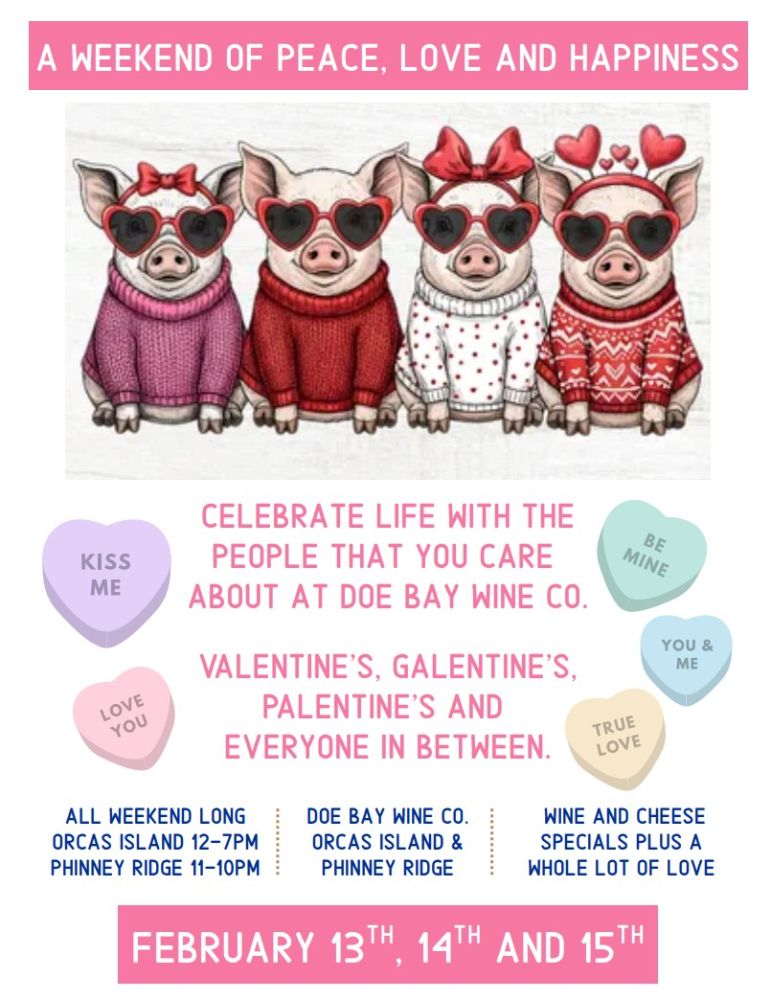 Valentine's, Galentine's, Palentine's, or just because! Spend Valentine's Weekend with the people you care about at Doe Bay Wine Company. All weekend long, we'll have a special wine and cheese that we've put together with love. This isn't just for couples. Bring your best friend, your crew, your mom, or come solo and meet some new faces. Orcas Island (Eastsound): 12-7 PM daily